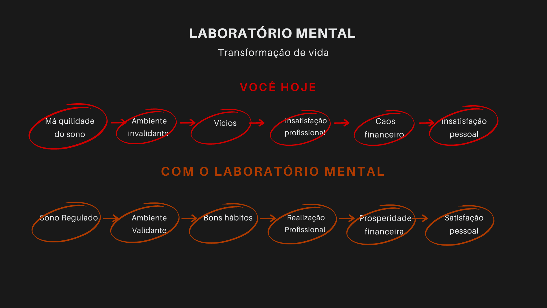 Com o Laboratório Mental, transforme sua vida com aulas sobre motivação, hábitos, vícios, higiene do sono, regulação emocional e comunicação. Aprenda as ferramentas necessárias para melhorar qualquer área da vida, ou aspectos de liderança para a sua empresa. Não é um curso. É um ambiente de alta performance que te ensinará com praticidade sobre psicologia e neurociências. Adquira agora e inicie sua jornada para construir um novo estilo de vida.
